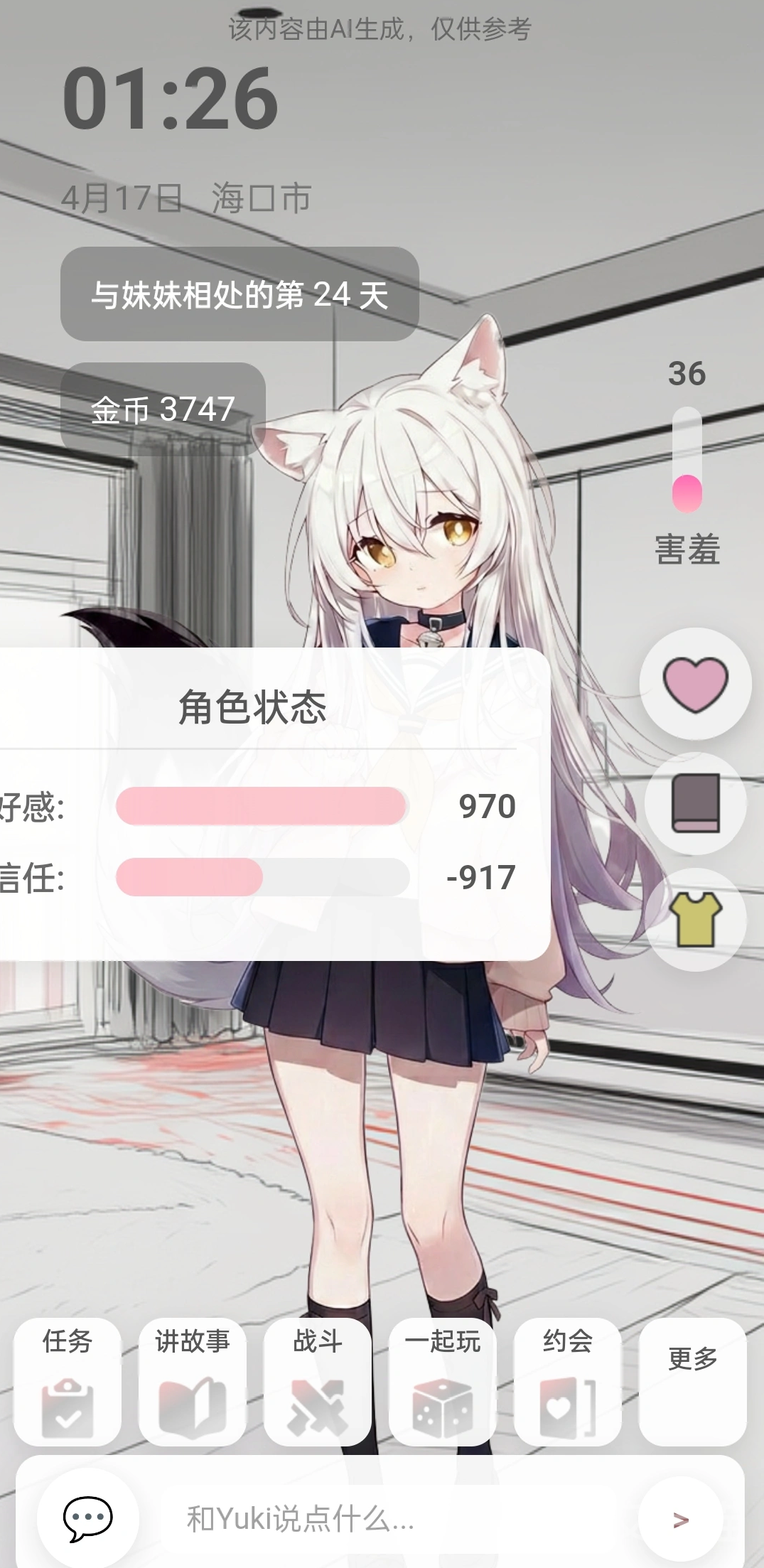 除场景驱动换装外,玩家还可通过自然语言交互主动引导穿搭行为。例如在对话框中输入“今天想看你穿校服”,提交后若角色应允,系统将在下一帧画面中实时渲染校服造型。为保障视觉协调性与叙事合理性,建议搭配校园类、教室类或放学路途等契合校服氛围的约会地点,使整体体验更具沉浸真实感。