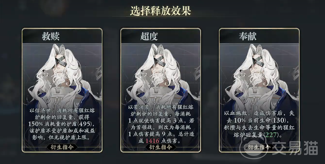 终结技“应消之苦”支持三选一效果:选择“奉献”,消耗15点狂气对全体敌人造成14点基础伤害,且每拥有1点猩红,该伤害额外提升0.75;发动后损失当前生命值的10%,并获得等量猩红。“超度”将全部猩红一次性消耗,使本次伤害提升至原始数值的4倍(即基础14点×4);“救赎”同样清空猩红,但可获得相当于消耗猩红总量150%的护盾值。