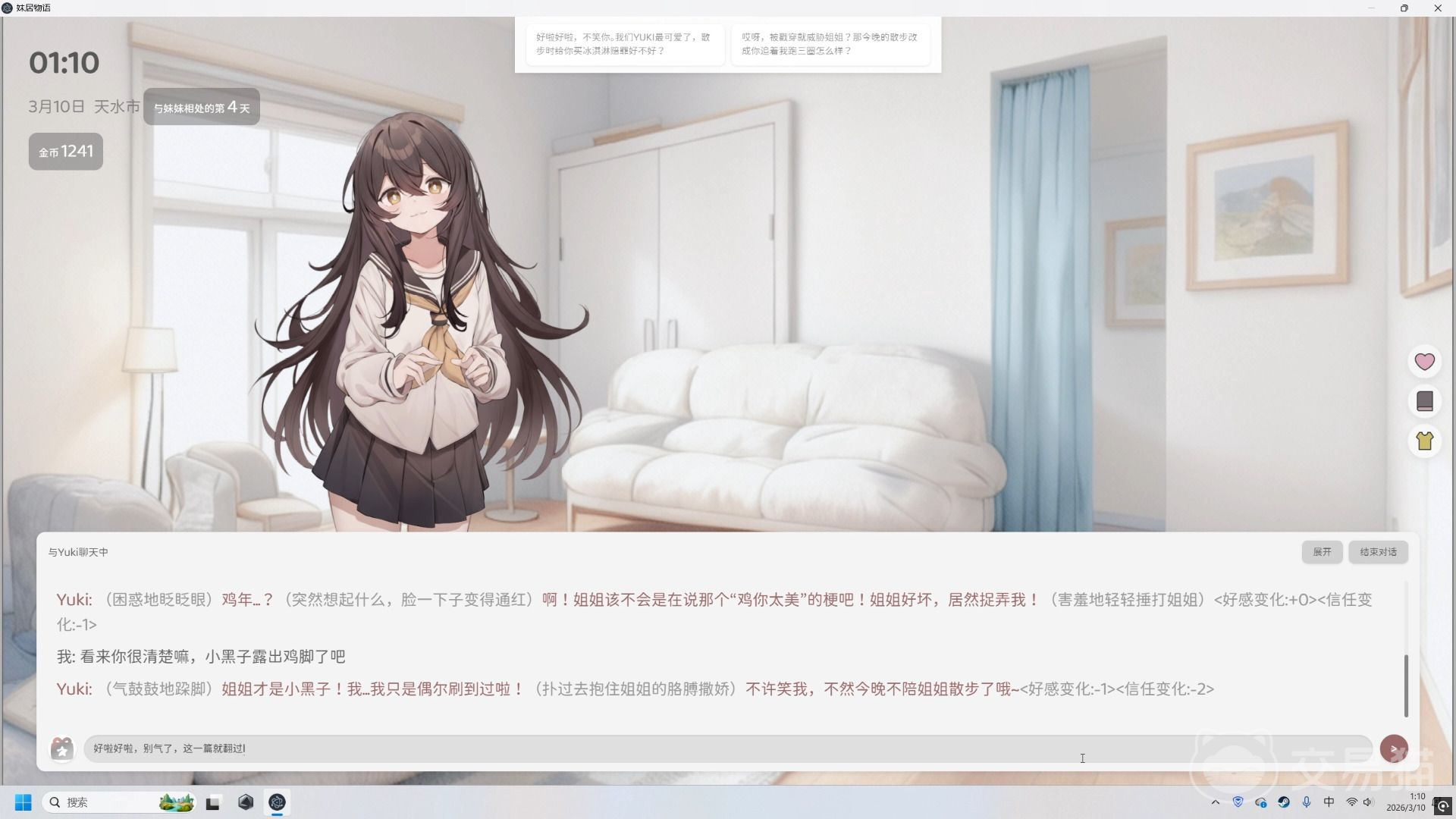 任务系统是初期积累资源的核心渠道。游戏内设有结构清晰的每日及主线任务链,完成后可稳定获得金币奖励。若金币储备暂时不足,还可参与内置的小游戏模块——每完成一局即可结算对应金币,所获资金可直接用于服装商城消费。购入服装后,在与Yuki的对话界面中选择“赠送礼物”,不仅能完成穿搭更换,还能同步提升亲密度数值,形成良性成长循环。