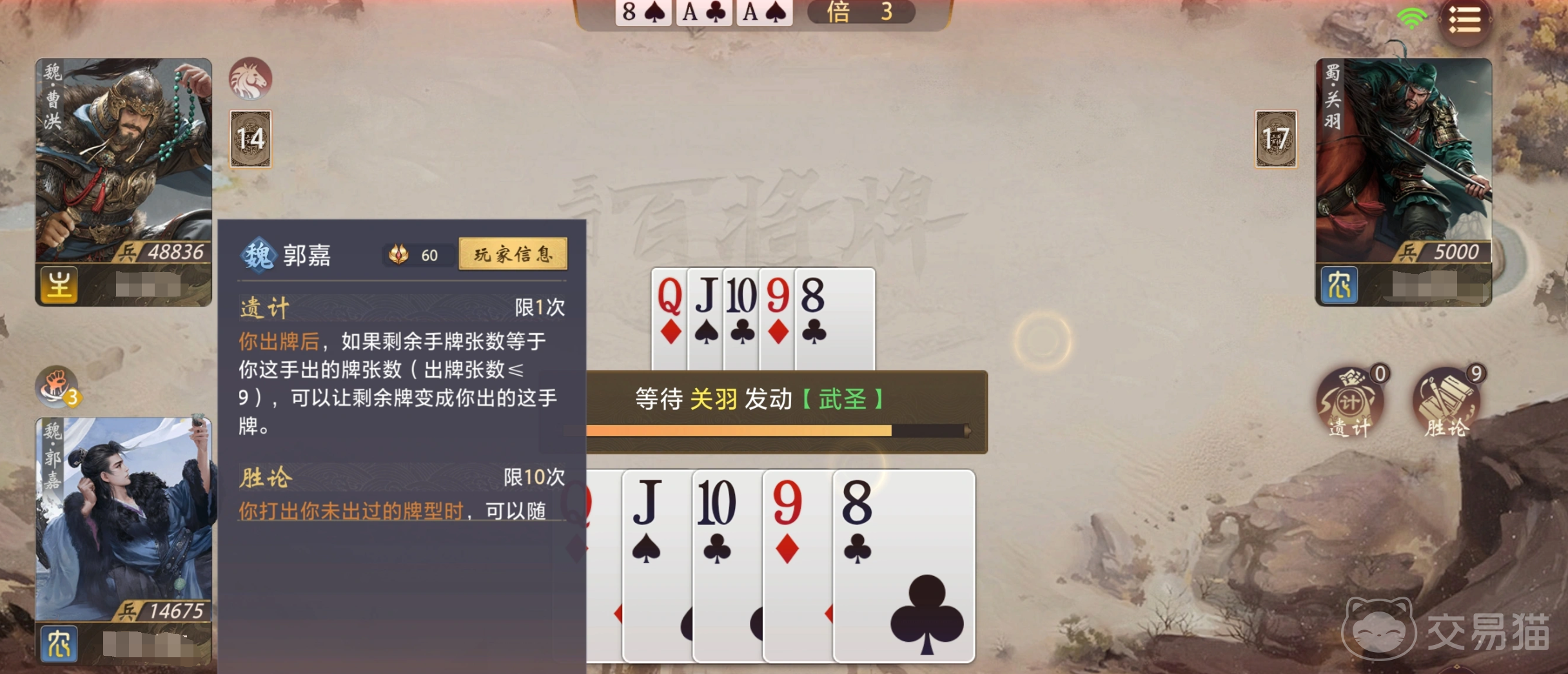 郭嘉的核心技能为【遗计】,触发逻辑明确:当玩家出牌后,若剩余手牌数恰好等于本次出牌张数,且该次出牌数量不超过9张,则可将全部剩余手牌立即转化为与刚打出的牌型完全一致的新组牌。该机制看似强大,实则高度依赖起手牌数控制——标准起手为17张,抢地主后为20张,二者均为奇数,因此开局即需通过合理弃牌或首轮出牌调整,确保后续任意一次出牌前手牌总数为偶数,否则遗计无法激活。