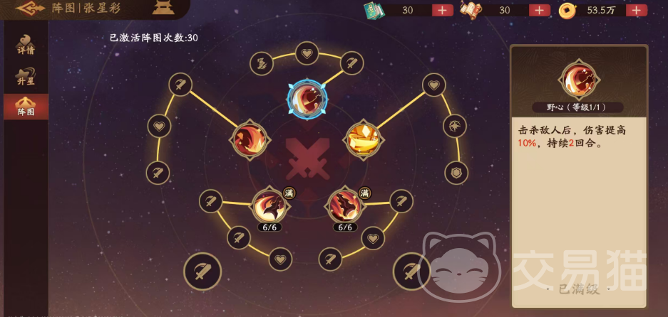 “野心”阵图赋予击杀反馈机制:成功斩杀敌方单位后,张星彩在接下来两个回合内获得10%伤害增幅;“仇忾”则针对生命值高于自身的对手,额外提升5%伤害。二者协同,使其在残局收割与越阶挑战中表现尤为突出。整体而言,张星彩的强度高度依赖连击频率与甚贤层数积累——连击次数越多,大招覆盖率越高,实战压制力越强。