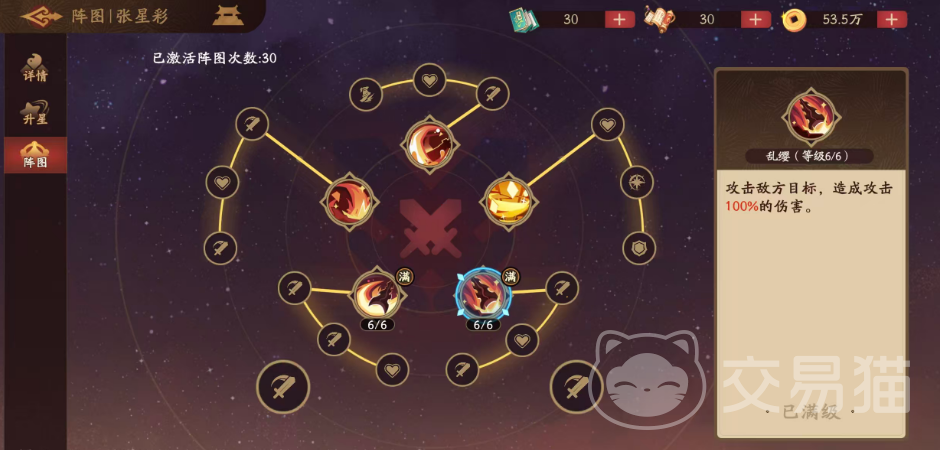 阵图系统为张星彩赋予多维战术适配性。“乱缨”阵图激活至6级后,攻击命中时可获得额外百分比伤害加成;“遁藏”则在承受群体伤害时降低10%所受伤害,显著提升她在AOE密集环境下的生存容错率。