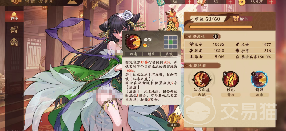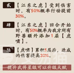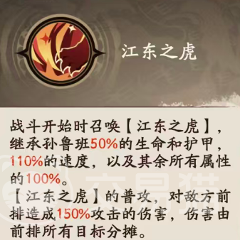 江东之虎的普攻对敌方前排造成150%基础伤害,但该伤害由前排全体目标均摊,因此单次普攻输出效率有限。真正具备战略价值的是其被动联动效果——每当江东之虎登场,立即为我方所有野兽系武将施加一层【虎啸】状态。该状态受控失效,即若孙鲁班被沉默、禁言或眩晕等控制效果命中,则无法释放。每层【虎啸】提供20%暴击率与20%暴击伤害加成,且可叠加至5层;仅需3回合即可叠满,实现暴击概率与暴击倍率的双重质变,显著提升整体爆发阈值。