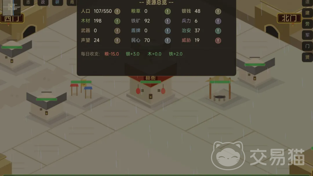 区别于传统单线经济驱动的经营游戏,《末代县令》强调多维发展协同:人口增长影响赋税基数,农田产出决定粮食储备,工坊升级关系器械制造能力,而治安与教化水平则直接关联民心稳定度。每一项决策都将触发连锁反馈,考验玩家的全局观与长期规划能力。
