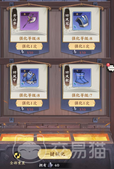 装备系统是战力构筑的核心路径之一。强化作为前置基础环节,需消耗大量精铁资源以提升等级上限;而装备品质本身即决定了该部件所能承载的最高强化等级——高品质装备具备更高成长天花板。值得注意的是,重置强化将返还部分精铁,但会损失已投入的时间成本,因此建议玩家在前期即明确主力培养方向,优先锁定长期适配自身阵容的职业定位与侠客类型,避免资源分散。