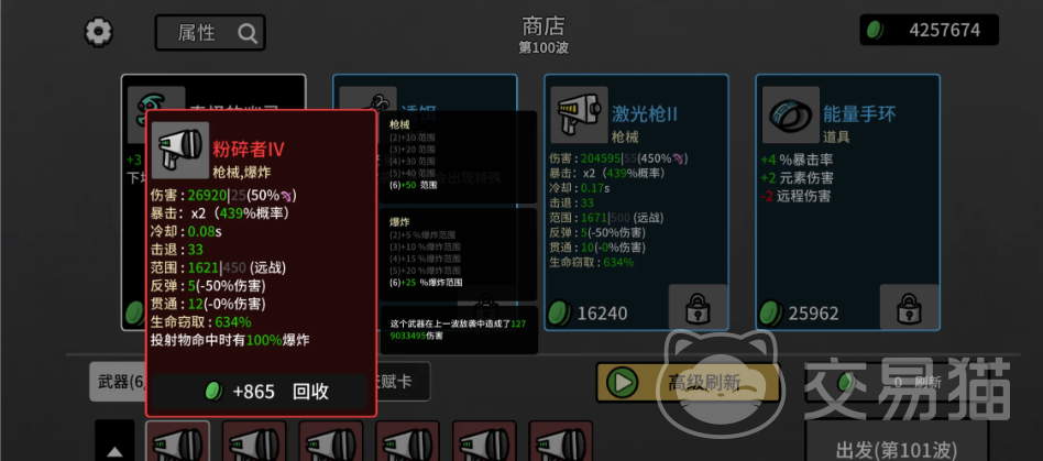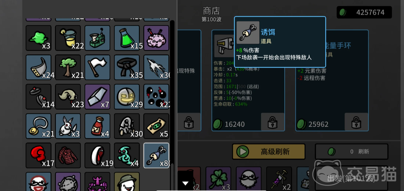 第20至40波进入装备转型期,单体输出已显疲软,需切换为范围压制策略。火箭筒成为首选主武器,其AOE伤害覆盖广、清场效率高,无需追求传说级武器即可胜任。生命窃取属性应列为刚性需求,配合护甲适度提升(建议维持在30%-40%减伤区间),防止被低血量小怪持续磨血致死。道具栏位中,除必备诱饵外,“另一个胃”“魔法绿叶”“水熊虫”“狂怒”均为高优先级拾取项,分别提供容错率、续航、无敌帧与爆发增幅。