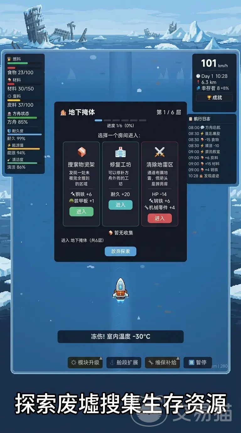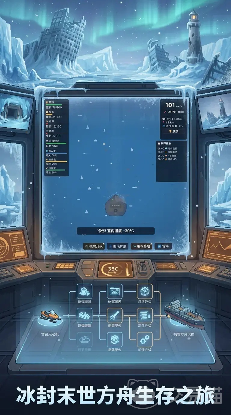 游戏设定中,全球陷入极端低温灾变,大地被永久冻土覆盖,生态系统几近崩溃。资源极度匮乏——食物、燃料、维修材料均需精打细算;船体结构持续承受严寒侵蚀,必须定期检修与加固,否则存在结构性损毁风险。环境机制真实严苛,风速、温度、结霜速率等参数实时影响方舟运行状态,强化了生存紧迫感。
