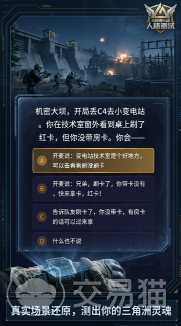 测试流程共包含27道结构化题目,全程耗时约7分钟。每题均还原《三角洲行动》真实作战场景(例如:遭遇伏击时优先掩护队友还是抢占制高点;发现稀有装备但时间紧迫时选择带走还是标记后撤离),并提供3至4个逻辑互斥的行为选项。作答无时限约束,鼓励深度思考;提交后即时显示群体选择分布,便于用户对照判断自身倾向是否属于主流策略或特色路径。