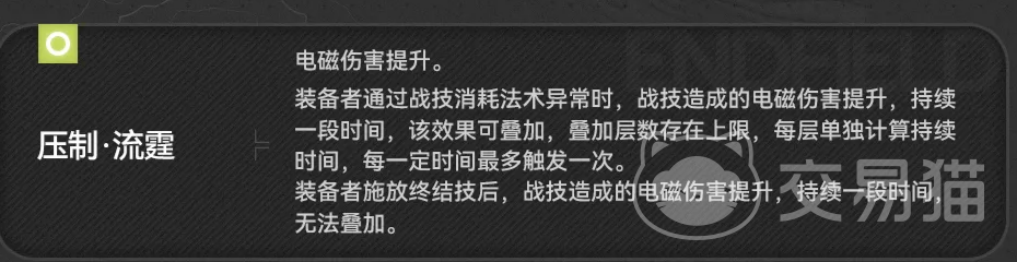 孤舟的核心机制名为“压制流霆”,具备双重作用逻辑:其一,直接提升装备者所造成的所有电磁伤害;其二,在干员使用技能消耗法术异常状态时,额外触发一层电磁伤害加成效果。该加成可叠加,上限为5层,每层独立计时,持续10秒。但存在1.5秒内置冷却,防止高频无序叠加,强调操作节奏与状态管理能力。