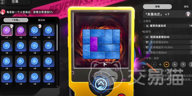 每位角色仅可装备一枚卡带,其主词条与副词条均为固定数值,仅随品质变化:例如暴击伤害词条,蓝色品质为12%,紫色品质提升至16%。卡带在首次掉落时即锁定全部副词条,后续通过强化等级自动解锁对应属性。驱动块则用于激活套装效果——装配卡带后,需嵌入指定数量的驱动块,方可触发二件套或四件套增益。以角色娜娜莉为例,每装配1个适配驱动块,即可提升5%暴击率;集齐套装后,剩余插槽建议统一使用二星驱动块,以最大化基础战力成长。