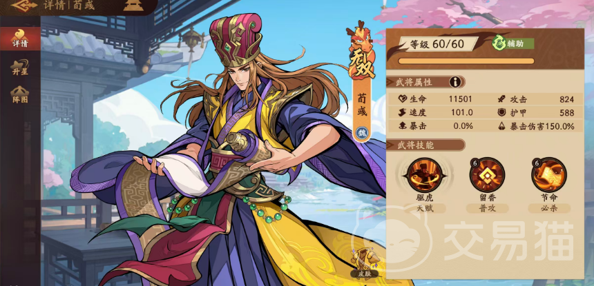 荀彧承担核心辅助职责,定位为智力型增益型武将。其存在可保障郭嘉各项技能数值不受衰减影响,并在敌方每个行动回合结束后,有25%概率对其造成等同于荀彧最大生命10%的伤害。此外,当荀彧通过“驱虎”天赋打出有效伤害后,还可降低目标15%攻击力,从而延缓敌方输出节奏,为我方争取更多怒气积累与技能释放窗口。