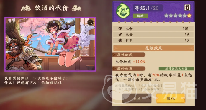 若暂未获取【世之奇才】,可选用紫色品质溯影【饮酒的代价】作为过渡方案。该溯影提供12%基础生命加成;其核心机制为:当己方任意角色怒气值为0时,有约70%概率为其恢复1点怒气,每回合限触发1次。该效果虽频率受限,但对前期怒气匮乏环境具有实用价值。需注意,该溯影的触发概率随等级提升而增强,建议及时强化以提高稳定性。