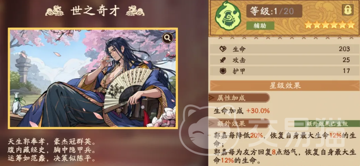 首选溯影为专武【世之奇才】。该溯影精准契合郭嘉的技能逻辑:提供30%基础生命加成;当郭嘉自身损失血量达20%时,立即恢复相当于当前最大生命值12%的血量;此外,每成功为友方恢复8点怒气,自身额外获得一次等额12%最大生命值的治疗。这一设计使郭嘉在承担伤害、主动卖血的同时,实现“受伤→回血→供怒→再回血”的正向循环,显著提升其站场稳定性与持续辅助输出能力。