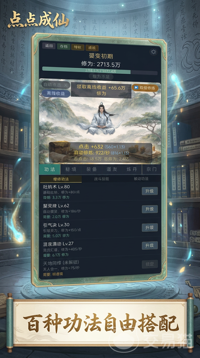 综上,《我只是点点怎么成仙了》以极简交互承载完整修仙成长线,通过科学规划洞府建设、合理配置功法组合、善用离线挂机机制,玩家可稳步跨越练气、筑基、金丹等各大境界,最终达成飞升目标。整套体系兼顾策略性与休闲感,是当前修仙放置品类中兼具可玩性与包容性的代表作之一。