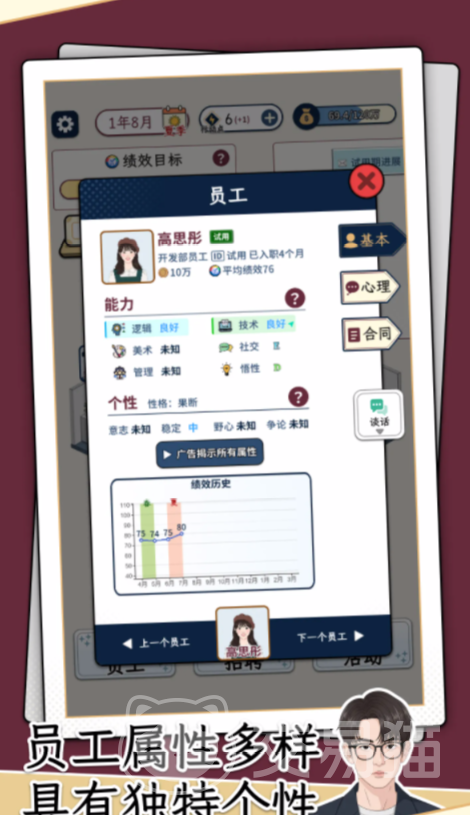 游戏开局即进入高强度招聘节奏:面对不同岗位的用人需求,玩家需快速浏览结构化简历,在有限时间内识别关键信息——教育背景是否匹配、项目经历是否存在夸大、职业空窗期是否合理。面试环节引入心理博弈机制,通过多轮开放式提问、压力测试与情景模拟,交叉验证候选人真实能力与性格特质。每位角色均配备独立档案,含成长轨迹、价值观倾向及潜在协作风险,为后续定薪、定岗提供数据支撑。