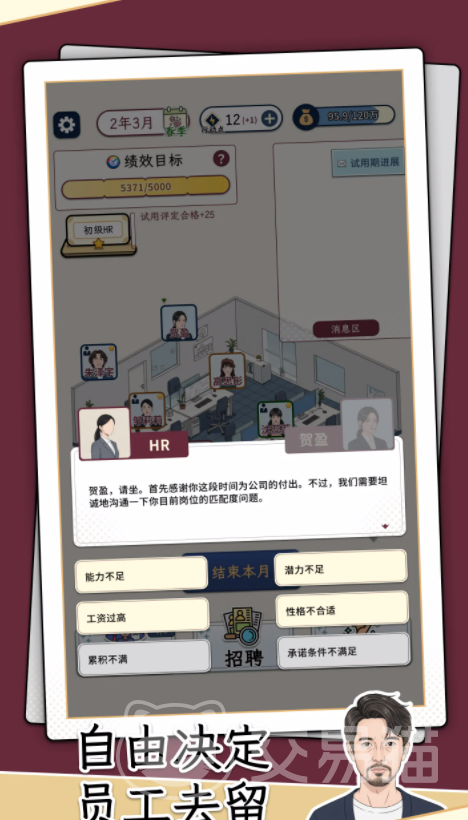 本作摒弃传统数值堆砌,聚焦文字驱动的决策纵深感。每一次简历筛选、每一场面试对话、每一项人事决议,都影响组织健康度与长期竞争力。玩家既是规则制定者,也是文化塑造者,在虚拟职场中锤炼识人、用人、育人的底层能力。欢迎进入《HR模拟器》,开启属于你的人力资源战略实践之旅。