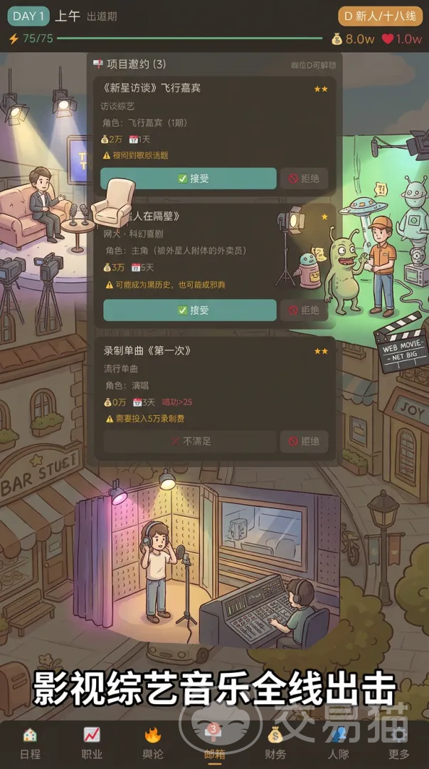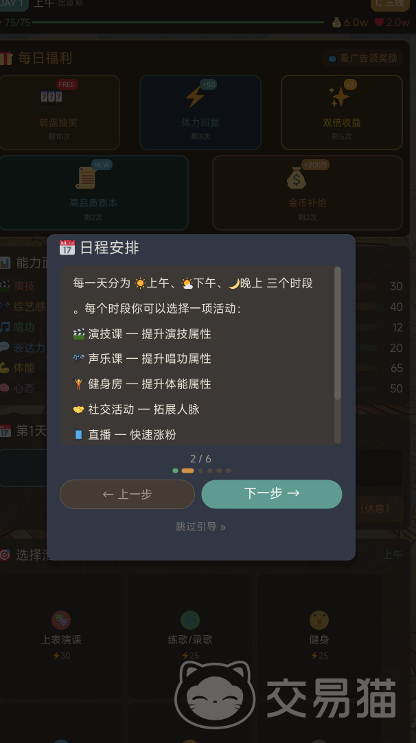 选定出道方式后,玩家将开启为期60天的明星生涯模拟。在此期间,需同步推进三项核心目标:提升个人咖位等级、拓展粉丝基数、积累可支配收入,并在年终盛典中争取更高综合评价。游戏采用三段式日程系统——上午、下午、晚上,每个时段可选择一项专属活动,例如报名演技课以强化演技属性;不同课程对应不同能力维度,建议依据所选出道路径匹配训练方向,实现高效成长。