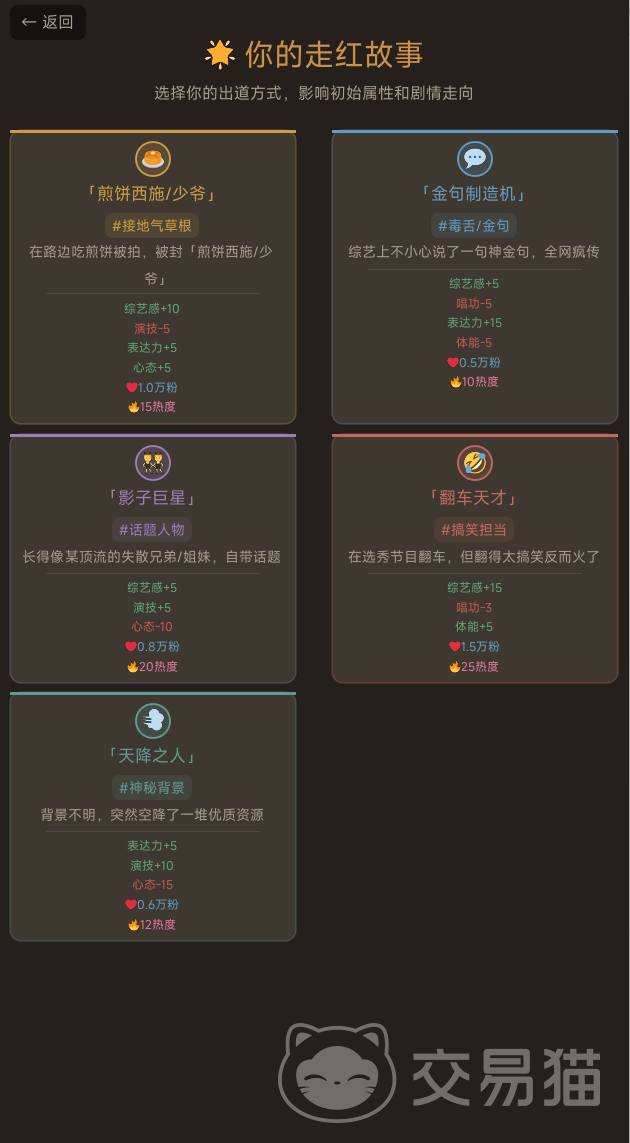 本作以沉浸式成长叙事为核心,细致还原普通人成长为公众人物的心理转变与现实挑战。游戏中设定了五种差异化出道路径:煎饼西施或少爷、金句制造机、影子巨星、翻车天才、天降之人。每条路线将直接影响角色初始属性数值及后续剧情分支,玩家需结合自身策略偏好慎重抉择。