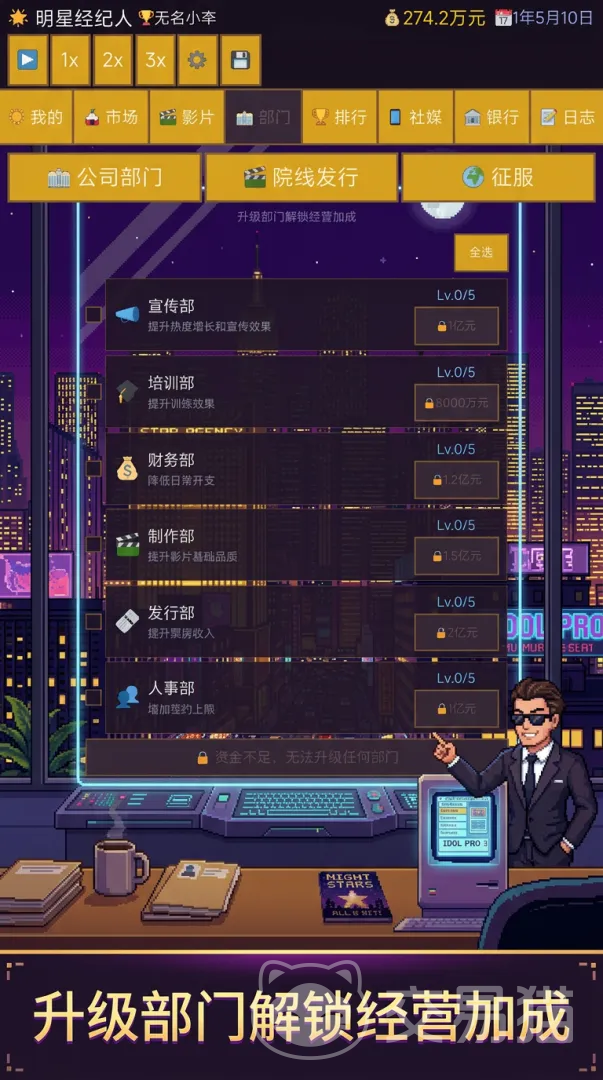 进入游戏后,玩家需首先创建专属经纪公司。该环节支持自定义公司名称、经纪人姓名及性别,并提供难度等级选项——不同难度将影响初期资源分配、艺人成长曲线及市场挑战强度,玩家可根据自身偏好合理选择。