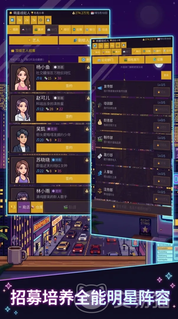 游戏内设“艺人市场”系统,是组建团队的关键入口。玩家可在该界面浏览待签约艺人的三项核心属性:演技、唱功与颜值。各项数值直接关联艺人发展潜力与走红概率;同时,艺人按品质划分为多个等级,高品质艺人具备更优的成长上限与事件触发权重。签约完成后,可前往“我的艺人”页面开展专项训练,定向提升对应能力值。