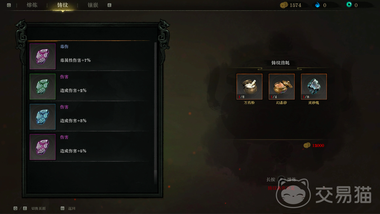 更进一步,羽毛可通过铸纹工艺进行功能升级:需消耗万药粉、幻晶砂、灵妙魄三种指定材料,并支付12000金币,将其炼制为附毒涂层。处理后的羽毛可作投掷类暗器使用,亦可绑定于箭矢实现远程毒伤叠加。该机制在群体清怪或Boss战中具备明确战术价值,尤其适用于需要持续压制或打断敌方技能节奏的场景。