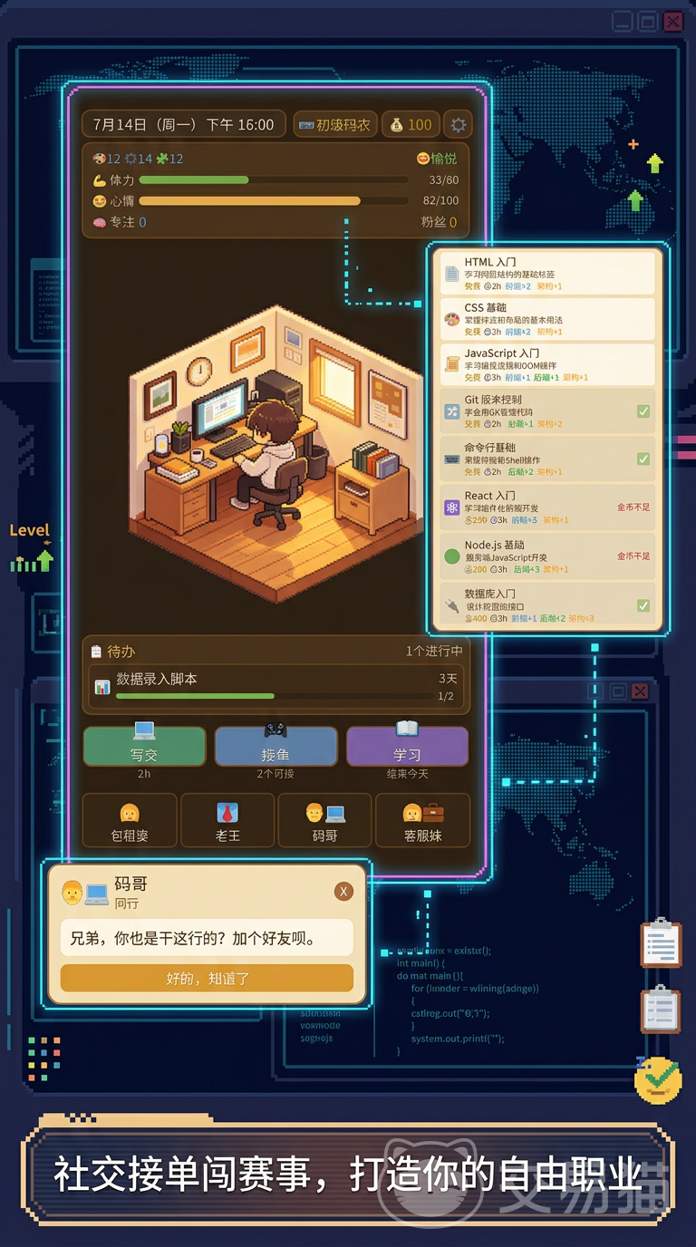 进入游戏后,首先需选定角色性别,确认初始身份,并熟悉核心界面模块:订单看板、技能树、健康值、资金余额及每日作息安排。这些系统共同构成玩家决策的基础依据,合理分配时间与体力是前期稳定发展的关键。