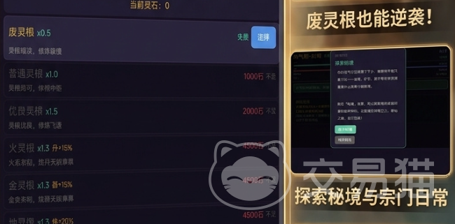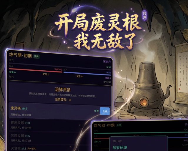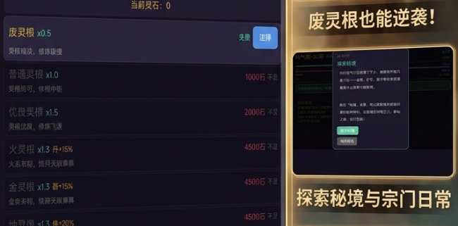 游戏核心设定围绕“废灵根”展开——主角初入宗门即被判定为资质低下,遭遇资源倾斜缺失、同辈排挤、任务边缘化等真实修仙生态困境。但此设定并非限制,而是自由修行体系的起点:灵根不绑定、功法无定式、境界非线性。玩家可自主抉择成长路径,打破传统修真框架,真正践行“我命由我不由天”的修道哲学。