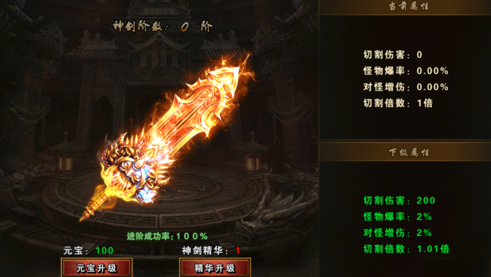 神器系统是前期战力跃升的关键入口。玩家可在开放后立即激活该功能,通过元宝或神剑精华两种方式提升神器阶级。每次阶级突破不仅直接增强切割伤害数值,还会同步提高怪物掉落率百分比;此外,受击减免等防御维度亦随阶级提升而强化。需注意:元宝途径依赖日常任务积累,而神剑精华则主要产出于指定副本——若副本未刷出足够材料,则需启用元宝补足升级缺口。进阶成功率逐级递减,失败后下一次尝试的成功率将固定提升5%,属可累积的保底机制。