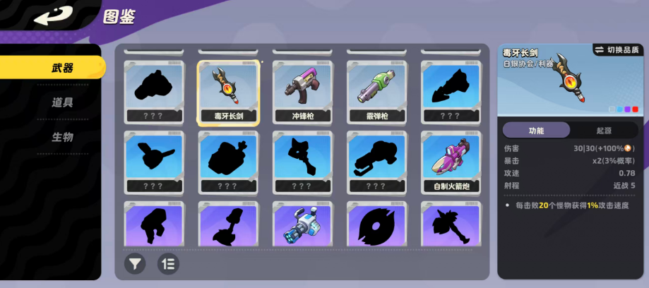 新手开荒阶段,毒牙长剑为首选过渡武器。其基础属性已满足前期清怪需求,且自带攻速加成,契合梅无寒对高频打击的依赖。进一步搭配白银协会阵营武器,可触发多重羁绊效果:每击败20名敌人,获得1%攻速提升;两把同阵营武器激活“生命汲取”效果,提供2%吸血;该数值随同阵营武器数量线性叠加,最高达6把时稳定获得10%生命汲取率。