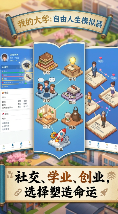 《我的大学》手游尚未公布正式上线日期,目前正处于内部测试阶段。这款以文字驱动为核心的模拟养成类作品,通过高度凝练的交互设计,真实还原大学四年成长轨迹——从专业选择、课程修读、社团活动到实习创业,每一次决策都将影响学业成绩、健康状态、人际关系与最终人生走向。