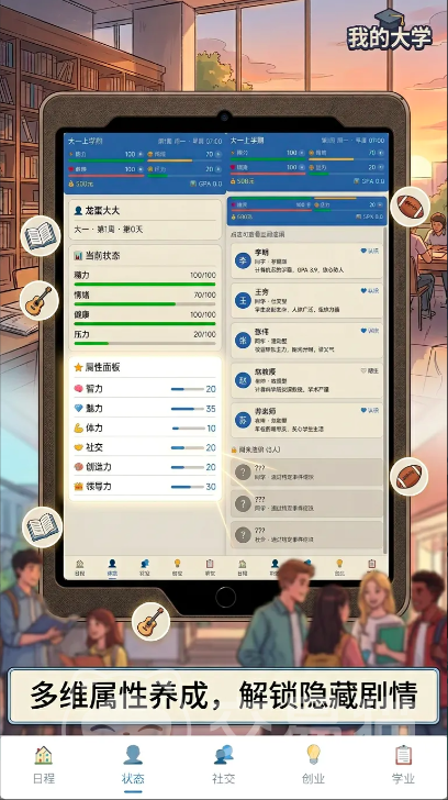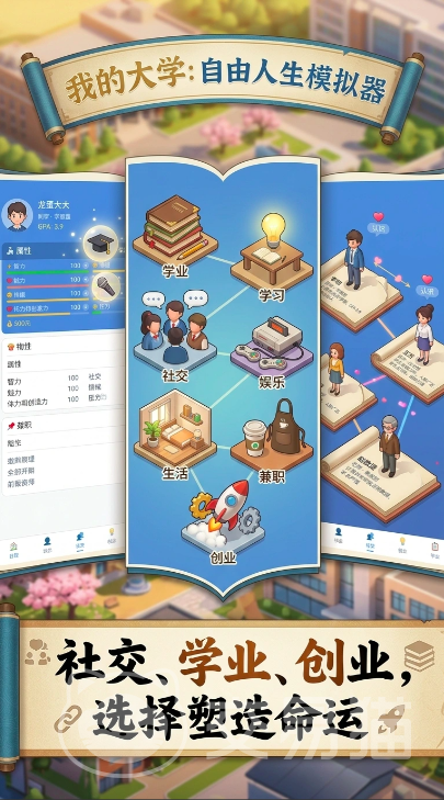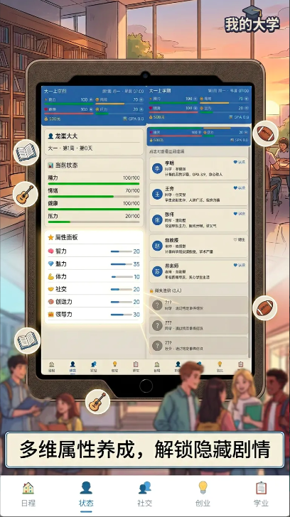 角色关系系统采用亲密度量化模型。玩家可通过日常对话、共同事件、节日互动等方式提升与室友、导师、恋人等NPC的好感度。当特定关系达到阈值,即可激活专属剧情线,并同步促进情商与智商双项成长。部分高价值道具与稀有结局仅可通过关系链解锁,构成差异化内容体验的重要组成部分。