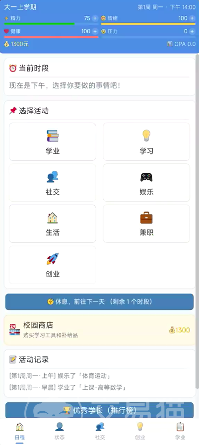 游戏世界观依托文字表格系统展开,摒弃繁复UI,以清晰结构呈现时间管理、资源分配与成长反馈。从大一新生报到,到毕业答辩筹备,全程无固定脚本,所有事件触发均基于实时数值判定与玩家行为序列。这种“低操作门槛、高策略纵深”的设计,使作品兼具大众可玩性与硬核重玩价值。