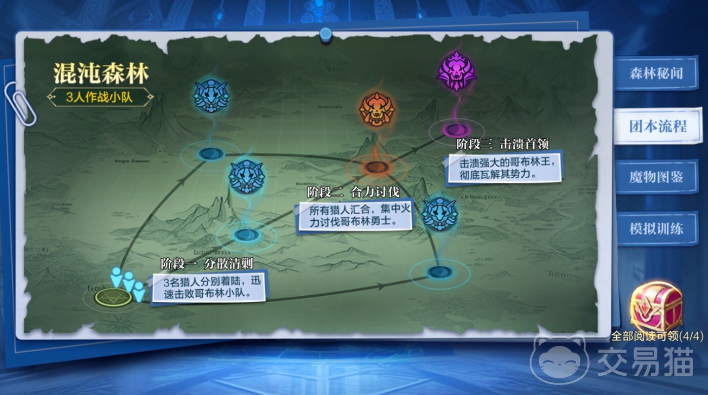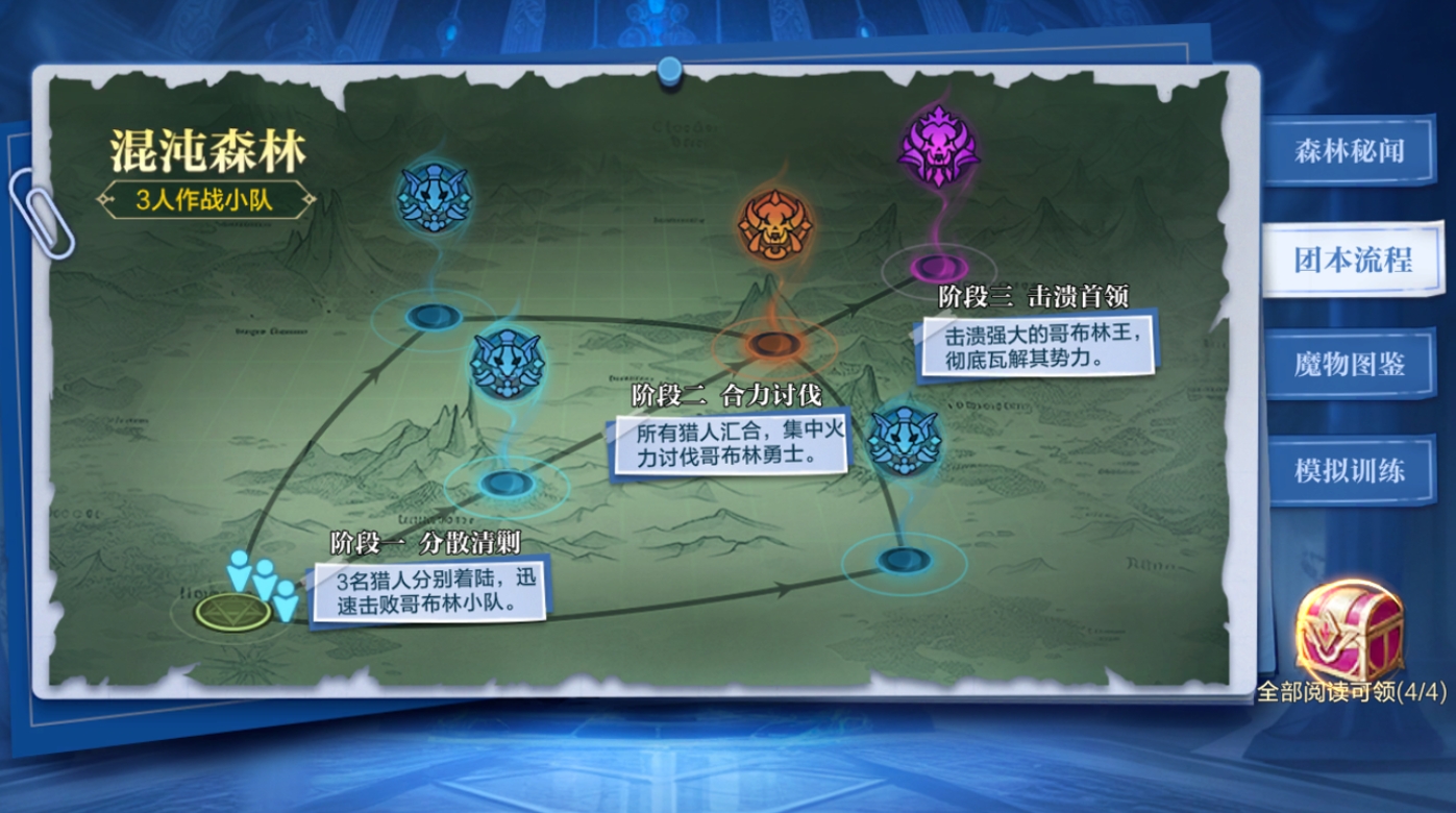 混沌森林共设三重递进式关卡,需固定三人小队协作完成。首阶段为独立清怪环节:每位成员在专属区域清理指定节点的哥布林杂兵,全员达成清场目标后自动解锁第二阶段。此阶段操作门槛较低,仅需优先集火处理具备远程火球攻击能力的哥布林萨满,即可高效推进。