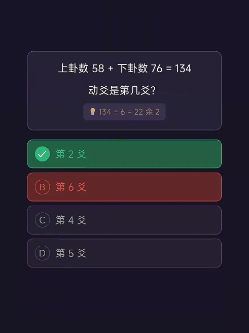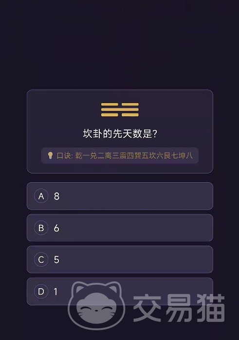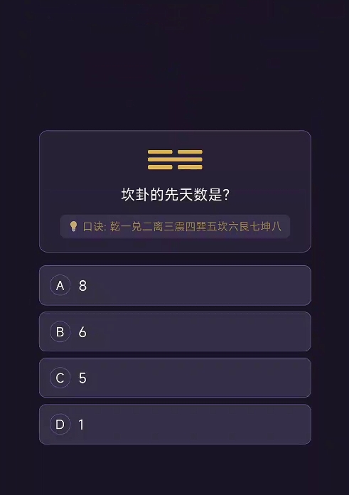 在“认识八卦”模块中,系统以结构化问答形式呈现乾、坤、震、巽等八种基本卦象,题目涵盖先天数(如乾一、兑二、离三等)、五行属性、方位归属及象征意义等内容。答题后即时反馈正确答案,并附带详实解析,帮助玩家厘清概念混淆点,同步生成个人知识掌握图谱,直观反映学习进度。