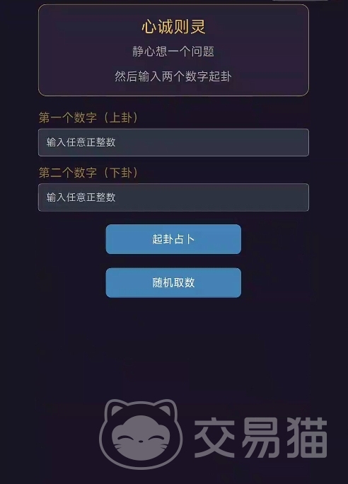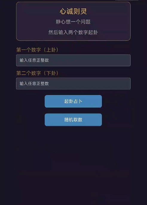 “自由占卜”模块支持手动输入上卦、下卦数字(范围符合梅花易数取数规则),亦可启用随机生成。系统依据数字自动完成起卦、互卦、变卦推演全流程,并逐层展示动爻判定、体用关系分析及吉凶结论推导过程,所有结果均配有对应经典文献依据与白话释义,便于玩家对照所学进行复盘验证。