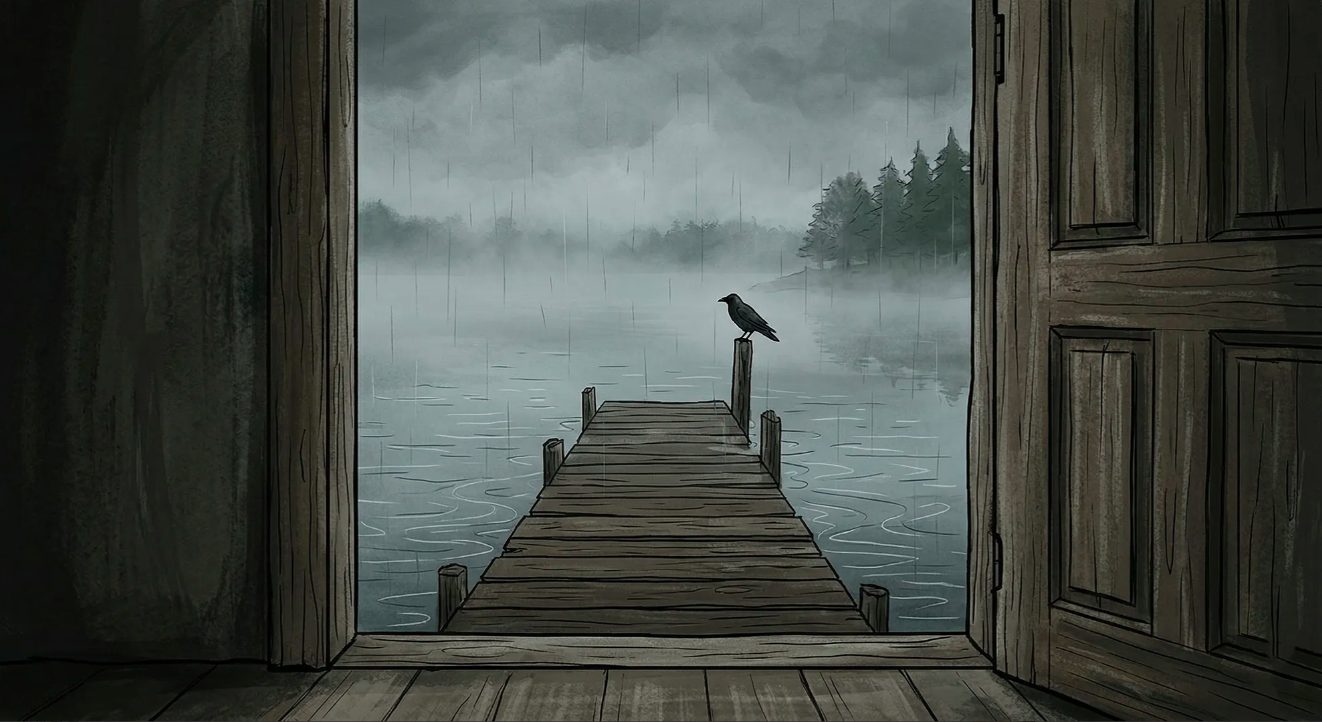 故事设定于常年笼罩在灰暗云层下的雾水镇,一起灭门惨案打破了小镇表面的沉寂。死者为一家四口,案发前曾反复听见急促而规律的敲门声;门开之后,唯见一只乌鸦静立桥头。身为调查员的哈里独自抵达现场,却在勘查过程中意外被困于血迹未干的凶案房间内。屋内陈设凌乱却暗藏秩序:一只躲藏在阴影中的黑猫、一张泛黄扭曲的全家福照片、墙角渗出的不明液体痕迹……所有元素并非随意堆砌,而是构成推理链条的关键支点。