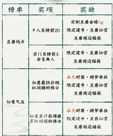 奖励配置突出实用性与收藏价值。灵兽战力榜个人总榜前20名,将获得灵兽周边福袋、专属限定道号及定制灵兽金球1g。其中,1g金球为灵兽进阶核心资源,获取难度较高,本次活动直接发放,显著降低养成成本。宗门榜前三名所属宗门全体成员(非仅宗主)均可领取对应福袋与限定道号,强化团队协作激励,契合多人协同玩法生态。