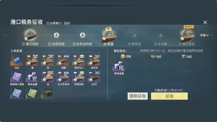 港口系统是中后期战力扩张的核心枢纽。每座占领的港口均提供固定税收产出,其资源量与港口等级正相关。升级港口不仅提升资源总量,更可解锁高级功能——例如派遣指挥官驻守维持运转,或开启港口间贸易航线。完成贸易路线配置后,不同港口特产可跨区域流通,带来持续性资金收益,为模块研发、战舰改造提供稳定经济支撑。