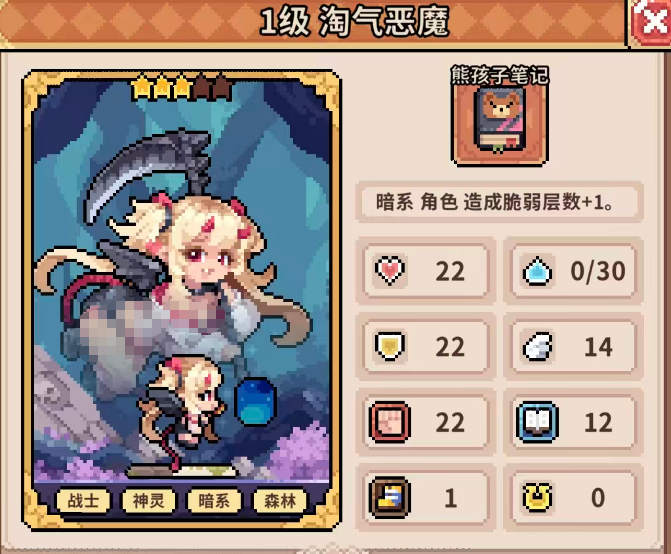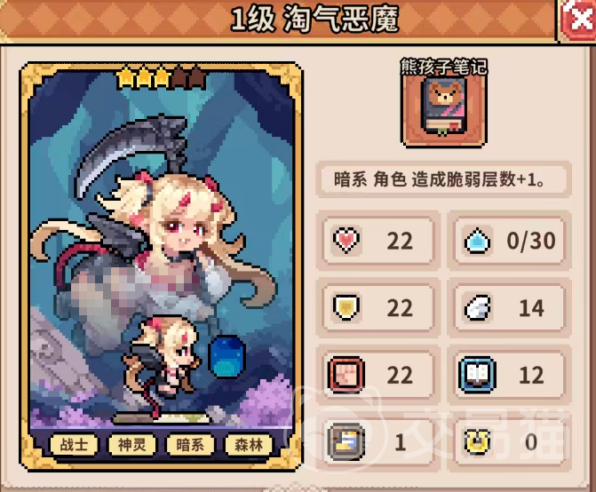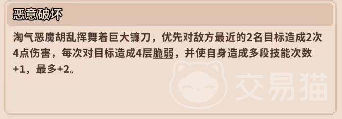 淘气恶魔作为第二脆弱引擎,与地灵使者形成协同闭环。其主动技能【恶意破坏】可对范围内两名敌人各发动2次攻击,总计造成8点伤害(单次4点),并在首次命中时直接施加4层【脆弱】。该技能最多可释放3次(含初始1次),高频次、高层数的脆弱投放极大压缩了敌方韧性恢复窗口。更关键的是,当淘气恶魔达到对应星级后,每次受击均可削减目标14点韧性,与地灵使者的破防能力形成战术互补——前者瓦解抗性,后者放大伤害,共同构建滚雪球式压制链。