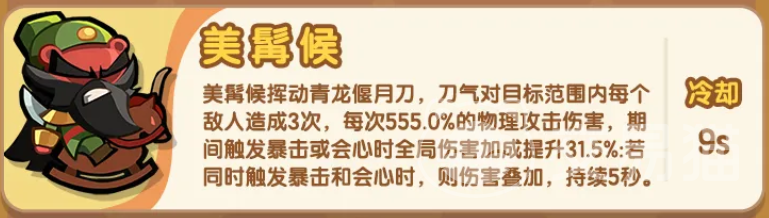美髯侯(关公)主打三段式高倍率斩击,每段输出为555%,三段总计1665%物理伤害。其强度成长高度依赖会心与暴击两项属性,后期可通过养成将二者均提升至约31%,从而大幅提升技能触发时的实际伤害期望值。该角色在配合减抗、破防类辅助时,能实现伤害快速叠加,属于典型的高上限爆发型战士。