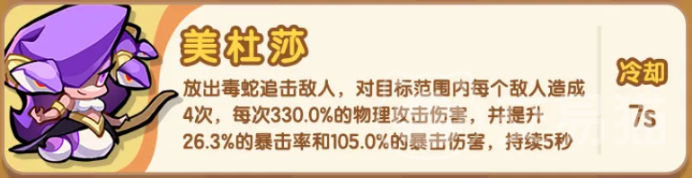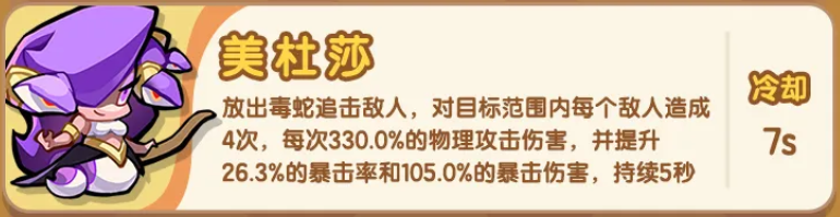 美杜莎以高频追击与稳定暴击输出见长。其技能可触发毒蛇协同攻击,形成4次独立判定的连击,每次造成330%物理伤害。随着暴击率与暴击伤害属性的成长,整体DPS呈指数级提升,在持久战与BOSS攻坚中表现尤为突出,适合作为队伍主C长期驻场。