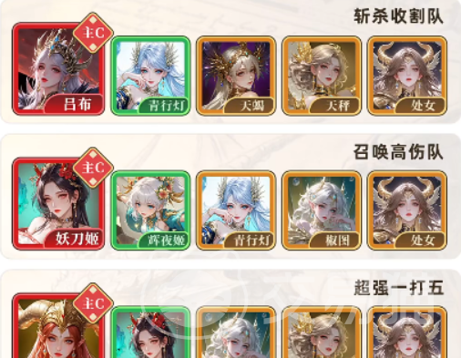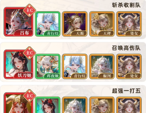此阵容围绕吕布打造爆发斩杀链:青行灯激活专属羁绊,提升吕布上阵即触发的初始增益;白羊女神与摩羯女神共同提供高额伤害加成,叠加后显著缩短连击启动时间;天秤女神保障技能释放频率与站场稳定性。整套配置强调“一击定势”,在敌方血线进入阈值后可迅速触发收割效果。