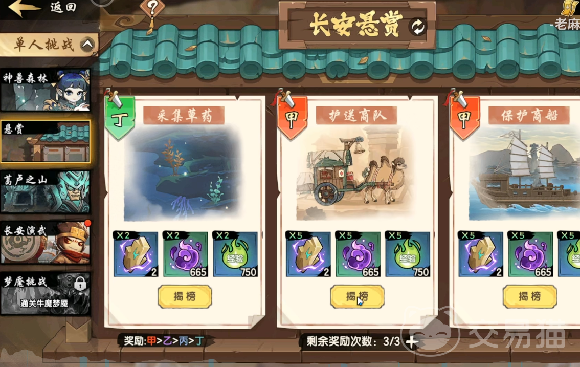 悬赏任务采用动态生成机制,每次刷新均呈现不同目标组合,共设甲、乙、丙、丁四个难度等级。其中甲级任务奖励最为丰厚,涵盖大量金币、稀有装备强化材料及专属技能书;丁级则仅提供基础经验与少量铜钱。建议优先承接甲级任务,若当前战力暂未达标,可使用每日3次免费刷新机会重新匹配——无需消耗任何道具或付费资源。