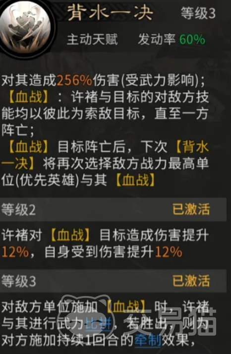 许褚的核心输出逻辑围绕“背水一决”展开——该天赋可对单名敌方目标造成256%的高额武力伤害,且最终伤害值严格随自身武力属性线性提升。高武力基础配合此技能,极易实现关键目标的瞬杀效果。与此同时,“背水一决”命中后会强制触发“血战”状态:许褚与指定敌方单位进入一对一锁定对战,双方所有技能仅能彼此交互,直至一方阵亡方可解除。若被锁定目标死亡,下一次“背水一决”将自动选取敌方当前战力最高者作为新血战目标,从而持续压制敌方核心战力。