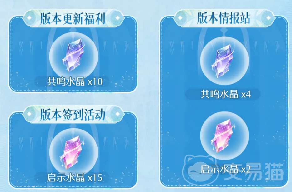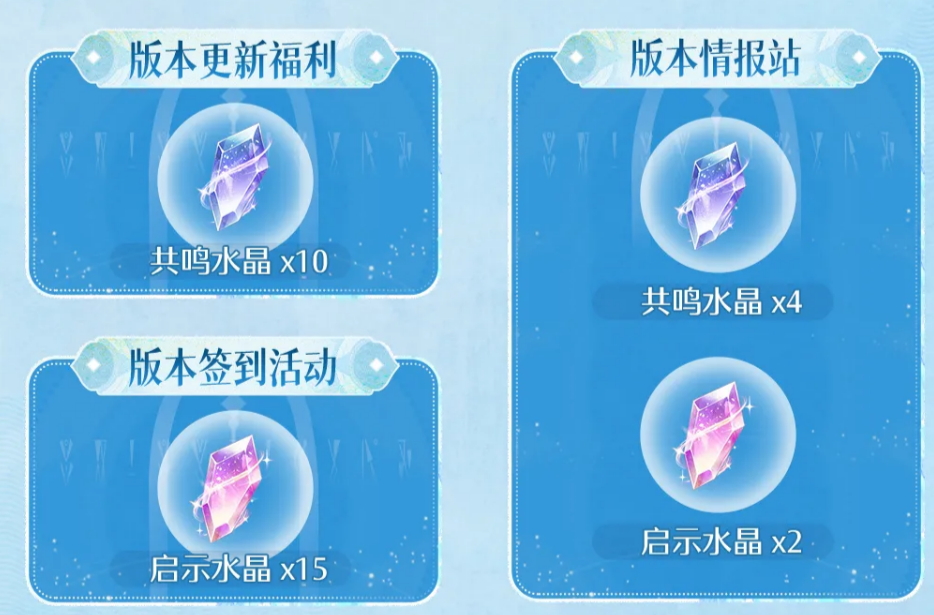 版本更新当日登录即可领取共鸣水晶×10;情报站页面完成基础浏览后可领取共鸣水晶×4与启示水晶×2;此外,连续签到活动共提供启示水晶×15,每日仅需一次点击操作即可领取,无任务链或难度限制。