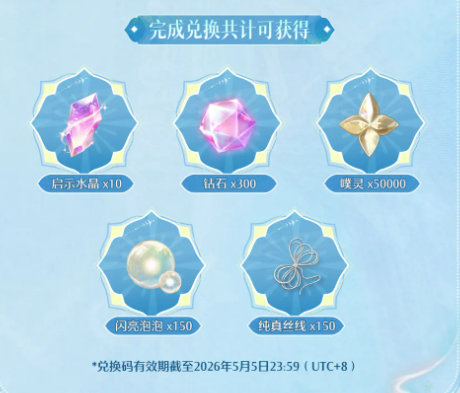 版本前瞻阶段共发布四组官方兑换码,分别为【无限暖暖灵魂大潮将至】、【花畔与龙骨的序曲】、【终途亦是新生】、【行至万灵汇聚之地】。全部成功兑换后,可获得启示水晶×10、钻石×300、噗灵×50000、闪亮泡泡×150、纯真丝线×150。所有兑换码统一有效期至2026年5月5日23时59分(UTC+8),逾期将自动失效,请务必及时领取。