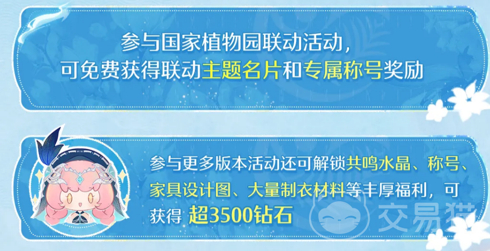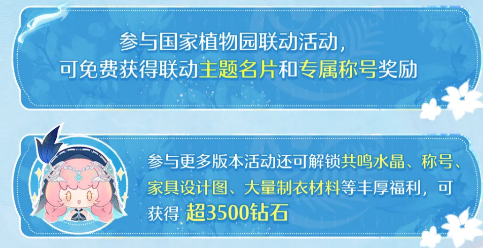 本次更新同步开启与国家植物园的官方联动活动。参与联动任务后,可免费领取专属联动主题名片及限定称号,具备收藏价值。其余常规活动亦提供丰富产出,包括共鸣水晶、个性化称号、家具设计图、各类制衣核心材料等,经综合折算,全部免费资源总价值逾3500钻石。
