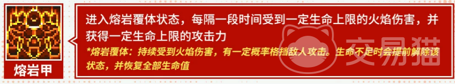 辅助技能“熔岩甲”赋予状态化作战形态:激活后进入熔岩覆体状态,期间每秒承受基于当前生命上限一定比例的火焰伤害,同时攻击力依据最大生命值提升;拥有概率格挡机制;若生命值低于临界值则状态提前终止,并立即恢复至满生命值,构成兼具输出与保底的复合型生存手段。