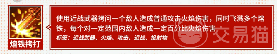 主动技能方面,“熔铁拷打”为基础近战强化技:使用近战武器命中单个目标后,除造成直接火焰伤害外,还会向四周溅射多枚熔铁碎片,落地即触发小范围火焰爆炸,实现“点杀+溅射”双重打击效果,显著提升清怪效率与站桩容错率。