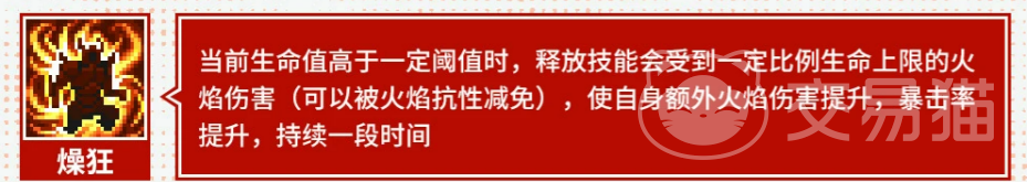 “躁狂”属条件增益型被动:当角色当前生命值高于设定阈值时,每次释放技能将扣除一定比例已损失生命值,但同步提升火焰伤害与暴击率。该机制要求玩家主动调控血量区间,配合火焰抗性属性可降低实际损耗,形成“以血换伤”的高风险高回报战斗风格。